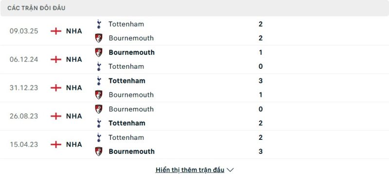 Thành tích đối đầu của Tottenham Hotspur vs Bournemouth