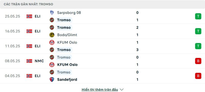5 trận gần nhất của Tromsø IL: W-W-W-L-L