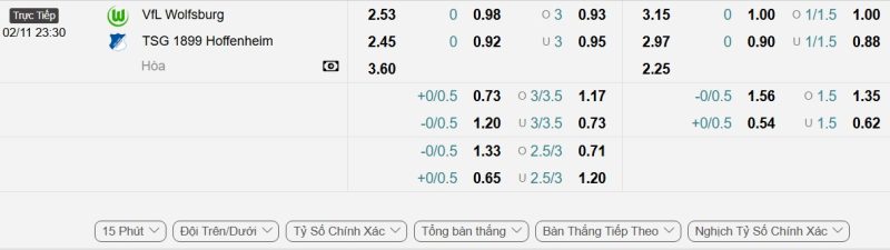- Kèo tỷ số bóng đá hiệp 1: VfL Wolfsburg 0-1 TSG Hoffenheim