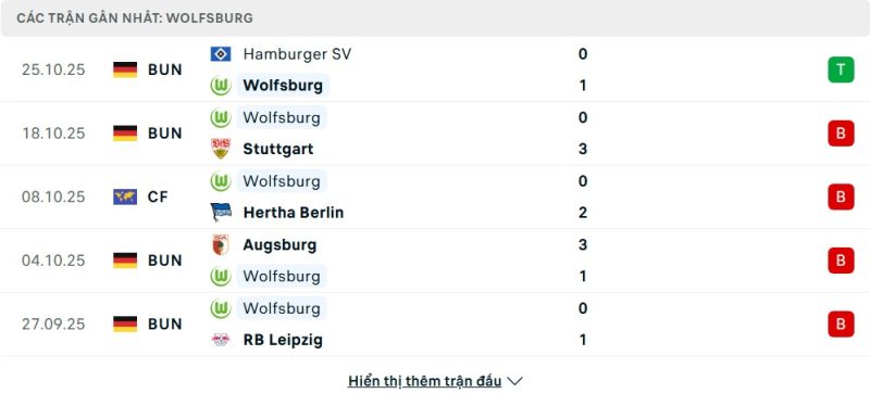 5 trận gần nhất của VfL Wolfsburg: W-L-L-L-L