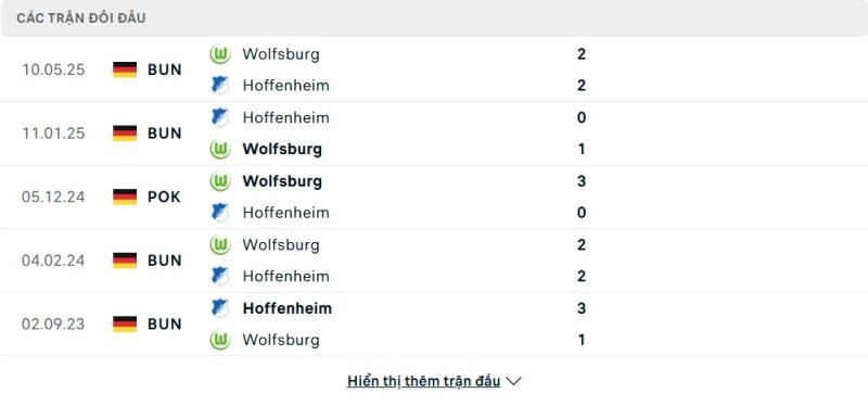Thành tích đối đầu của VfL Wolfsburg vs TSG Hoffenheim