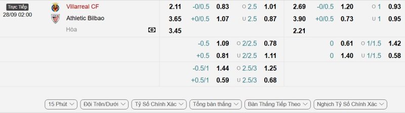 - Kèo tỷ số bóng đá hiệp 1: Villarreal 1-1 Athletic Bilbao