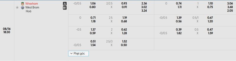 Bảng Tỷ lệ kèo bóng đá Wrexham vs West Bromwich Albion