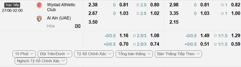 - Kèo tỷ số bóng đá hiệp 1: Wydad AC 1-2 Al Ain