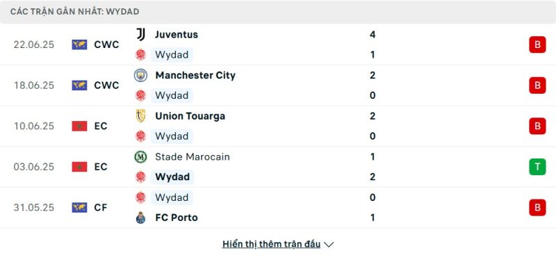 Wydad AC đã không thể hiện được nhiều điều tại Club World Cup 2025. Sau hai lượt trận, đại diện Maroc toàn thua: 0-2 trước Manchester City và 1-4 trước Juventus. Họ chỉ ghi được 1 bàn và để lọt lưới tới 6 lần, một hiệu số đáng thất vọng cho đội bóng từng được kỳ vọng gây bất ngờ. Cách nhập cuộc của Wydad còn thiếu mạch lạc, hàng công rời rạc và hàng thủ thường xuyên mắc lỗi vị trí. Trận cuối cùng vòng bảng sẽ là cơ hội để họ níu kéo thể diện trước khi rời giải.
