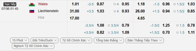 Bảng Tỷ lệ kèo bóng đá Xứ Wales vs Liechtenstein