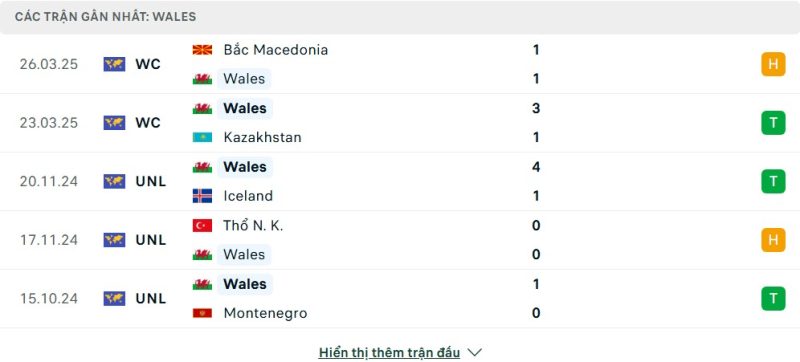 5 trận gần nhất của Xứ Wales: D-W-W-D-W